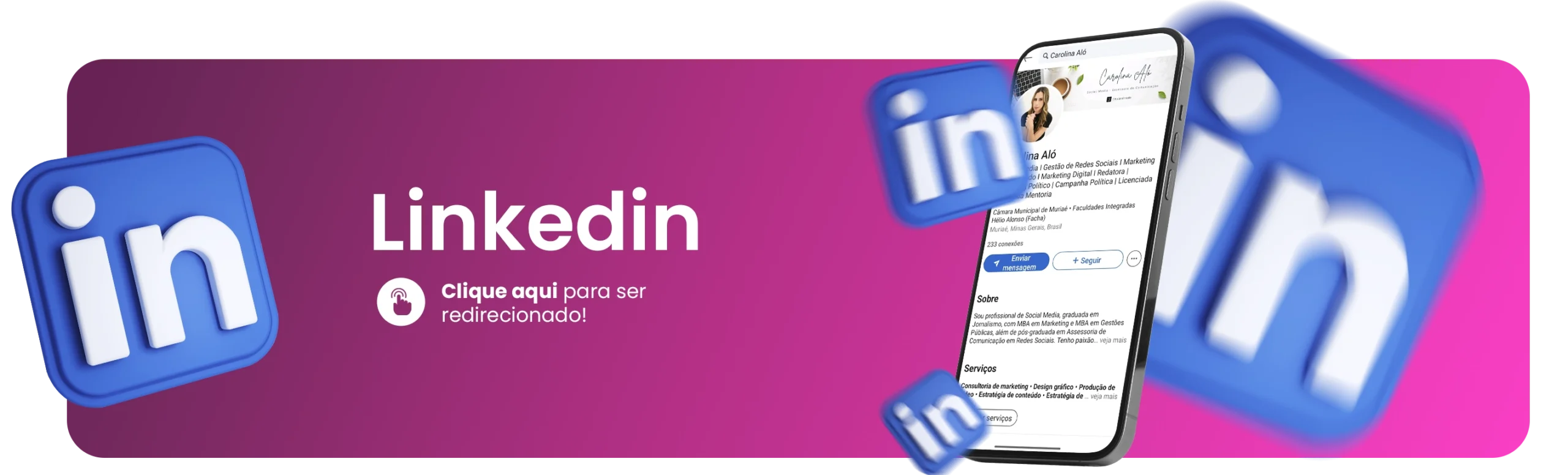 Olá, meu nome é Carolina Aló e sou formada em Comunicação e possuo MBA em Marketing, além de especialização em Marketing Digital para Gestores Públicos e Comunicação Integrada em Redes Sociais e Imprensa.